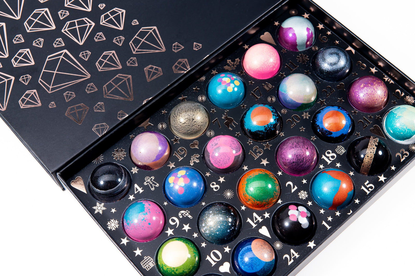 Each Chocolate Jewel™is a miniature composed dessert, made with carefully constructed layers, and featuring flavors inspired by the genius of French pâtisserie such as Crème brûlée and dark chocolate tart