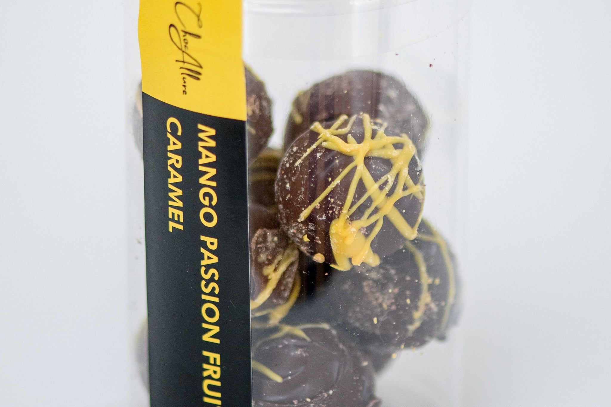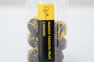 Nine truffles filled with fresh mango and passion fruit caramel, coated in 64% dark chocolate, and topped with passion fruit infused chocolate. A smooth, tropical blend of fruit and dark chocolate.